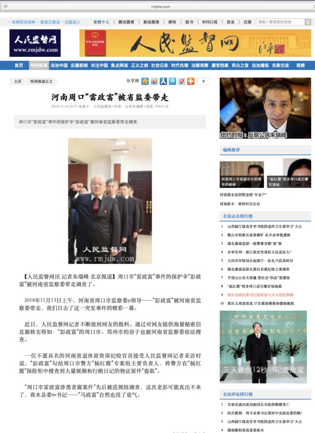 2018年11月16日,人民监督网独家报道了周口市纪委副书记、监察委副主任彭如祥于11月13日被河南省监察委带走调查的快讯。彭如祥的周口市、郑州市的房子也被河南省监察委依法搜查。