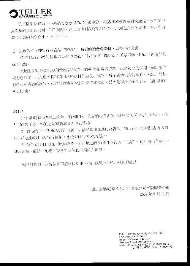 一、安抚消费者,1-2年内不让他开口 二、与“百度”搜索引擎媒体合作,拿到新闻话语权 三、以攻为守、搜集行业竞品“肾结石”负面的消费者资料,以备不时之需。 综上: 北京涛澜通略国际广告有限公司三鹿服务小组