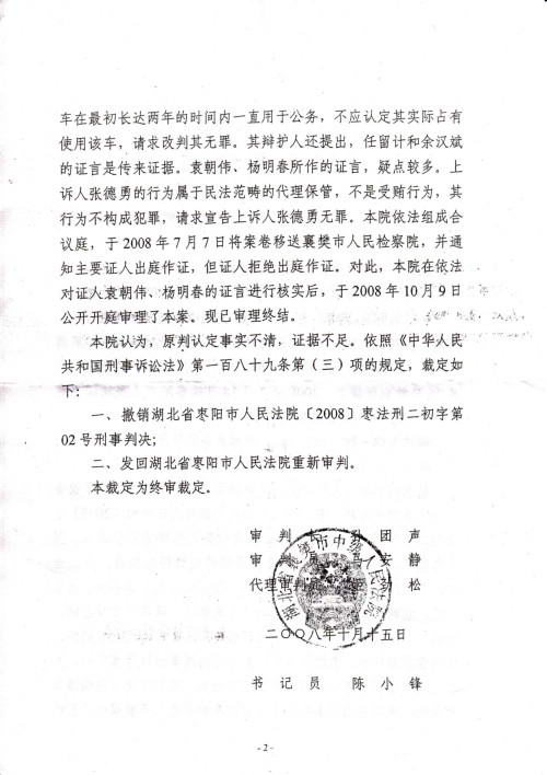 2008年10月15日,襄樊市中级人民法院公开开庭审理后认为枣阳市法院对张德勇警官受贿案的判决,事实不清、证据不足,裁定撤销原判、发回重审。
