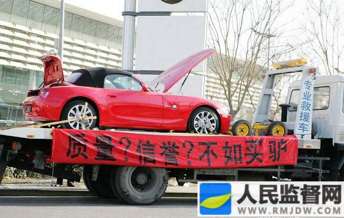 一辆崭新的宝马Z4敞篷跑车躺在一辆救援车的上面,上面写着“质量?信誉?不如买驴!”一看就知道,又是一个宝马车主关于质量方面的愤怒抗议,和宝马车主聊天中得知,车主是内蒙古人,在06年12月底花60多万在燕宝买了一辆宝马Z4,我想车主也是一个爱车的人,都没有直接开回去,而是用一辆平板车运到了内蒙,结果倒那边,发现车在行使过程中有严重的动力不足,后来仔细观察后发现,车漆有后喷漆的迹象,发动机上面的一颗螺丝已经严重随坏,车底盘竟然有普通锁丝。