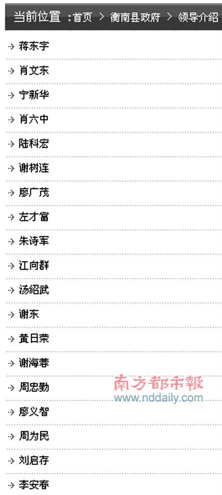 南都记者在常宁市政府网站和其所属的衡阳市政府网站上也发现了长长的领导名单,常宁市政府网站上列出的市政府领导共有19人,包括了1名市长,1名常务副市长,5个副市长,2个市长助理,2个正县级干部,4个副县级干部,1个调研员,2个副调研员和党组成员、办公室主任。