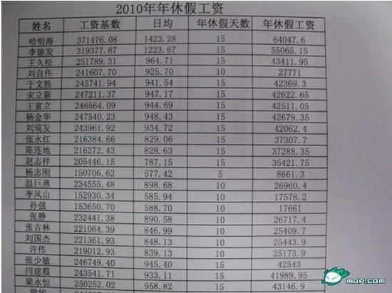 日前在百度、猫扑等各大网络论坛及微博上,“2010年年休假工资”、“沧州市联社2011年1月工资发放表”、“2010年表外工资”等表格被广泛转载传播,引起网友围观。这些表格显示,沧州市农村信用社联合社的员工2010年工资基数多在20万以上,最高的能达到37万。而年休假天数则在5天到15天不等,由此计算出的年休假工资则在8000多元到6万多元不等。此外,还发放了烤火费、购物卡等奖金福利。