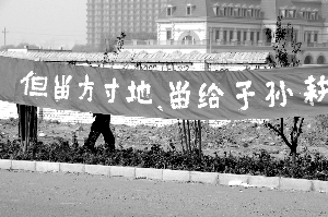 17日,香河县安平镇谢屯村农民打出横幅,要求还农民土地。新华社记者 王炳美 摄