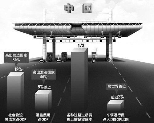 国家发改委经济贸易司副司长耿书海指出,中国各种过路过桥费已高达运输企业成本的1/3,高速公路收费标准过高,应大幅降低。2011年3月10日,全国人大代表黄细花援引媒体报道指出,同一车货物委托物流公司运送,从广州至北京全程遵章守法,不超载,一车货物不但没钱赚,还亏了3200元,运输成本从广州至北京比从广州到美国还要贵。
