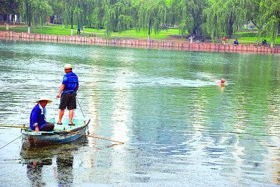 警示牌阻止不了市民下湖游泳。曹卢杰 摄