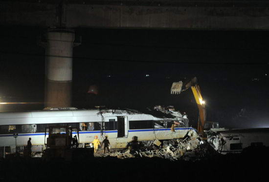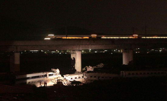 7月25日傍晚,事故车辆残骸上方列车运行正常。当日,甬温线特别重大铁路事故路段恢复通车。新华社记者 黄宗治 摄