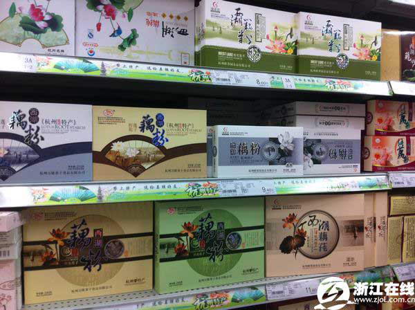 记者首先来到位于华光路30号,吴山广场附近的世纪联华超市,该超市以专营土特产为主。店内摆满了两大架的藕粉,生产商不一,有天堂、万隆、醇香园、采芝斋等几个牌子。因为口味、重量及包装不同,藕粉的价格在15元到22元不等。