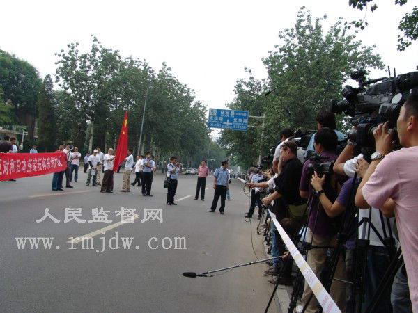 《人民监督网》记者看到,一位日本使馆官员在大门铁栅栏里面向外窥望,并用笔在本子上记录者。示威领队用喇叭对记者采访区说:“世界各国的记者朋友们记住了,日本人的德行,OK,我们给他们送过去”。最后由示威代表张立昆先生将“抗议信”投至日本使馆信箱。