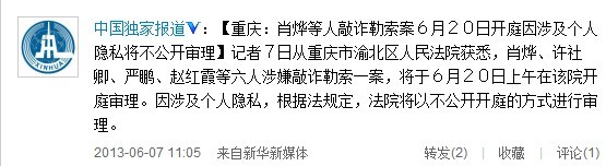 【重庆:肖烨等人敲诈勒索案6月20日开庭因涉及个人隐私将不公开审理】记者7日从重庆市渝北区人民法院获悉,肖烨、许社卿、严鹏、赵红霞等六人涉嫌敲诈勒索一案,将于6月20日上午在该院开庭审理。因涉及个人隐私,根据法规定,法院将以不公开开庭的方式进行审理。