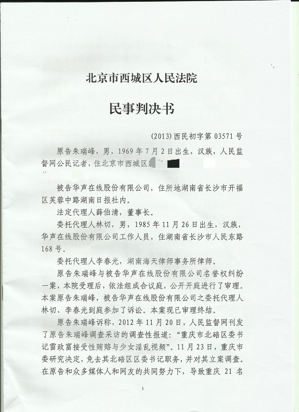 据香港媒体《大公报》7月24日报道,从雷政富案爆料人朱瑞峰处获悉:近期,朱瑞峰状告湖南日报报业集团华声在线网站“华声论坛”名誉侵权案获得胜诉。其中,对于朱瑞峰“公民记者”的身份获得司法和中国官方的认可,引发各方的关注。