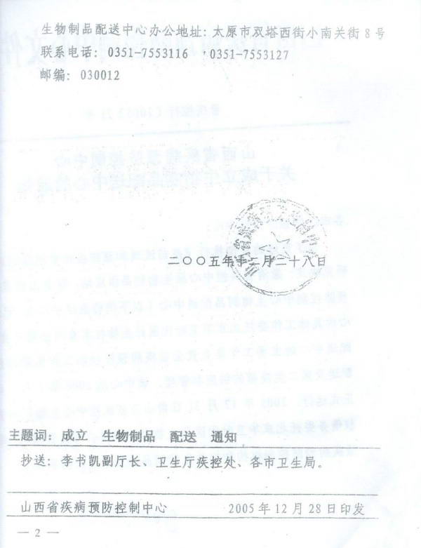 李书凯、栗文元炮制的晋疾控行(2005)21号红头文件中,“设立山西省疾病预防控制中心生物制品配送中心。配送中心的具体工作委托北京华卫时代医药生物技术有限公司负责。该配送中心的主要工作是负责全省疾病预防控制工作所需的疫苗配送及二类疫苗的供应和管理。”并任命北京华卫公司总经理田建国为生物制品配送中心主任。