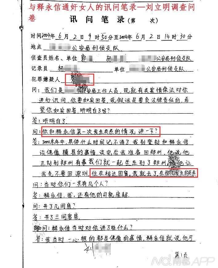 方丈释永信举报者释正义昨日(7月31日)下午14时23分向南都记者发来两份疑似某市公安局刑侦支队的询问笔录,涉及一场财务和感情纠纷,指释永信与一名为刘某的女性通奸。