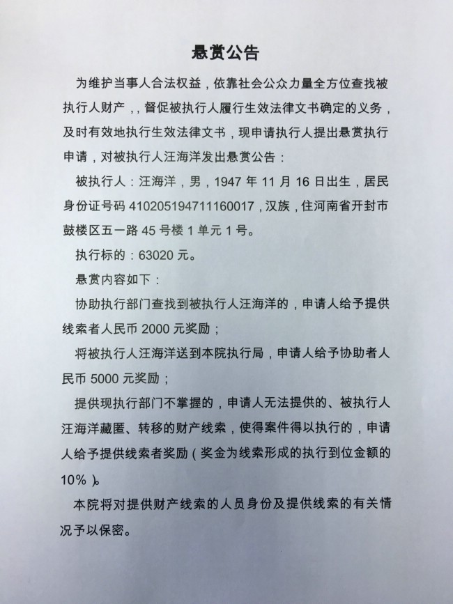 为维护当事人合法权益,依靠社会公众力量全方位查找被执行人财产,督促被执行人履行生效法律文书确定的义务,及时有效地执行生效法律文书,现申请执行人提出悬赏执行申请,对被执行人汪海洋发出执行悬赏公告: