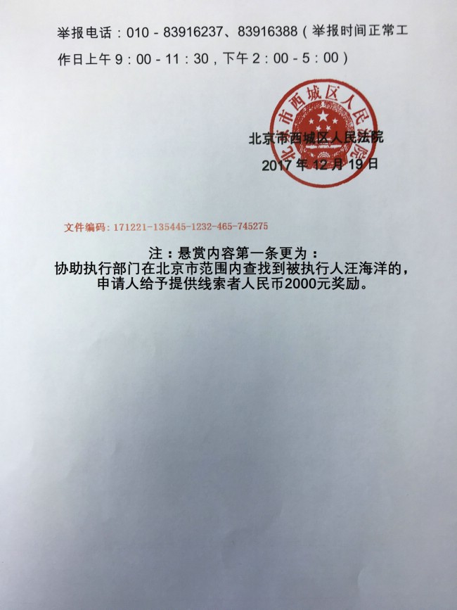 协助执行部门在北京市范围内查找到被执行人汪海洋的,申请人给予提供线索者人民币2000元奖励;