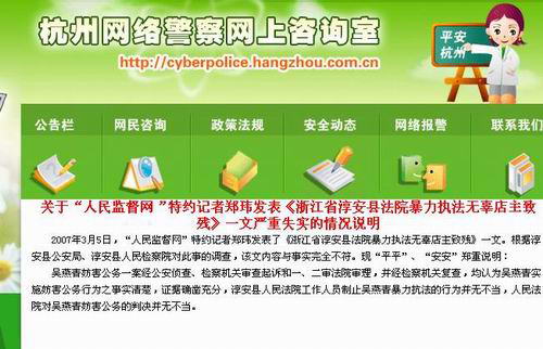 我的子女告诉我,你们的《人民监督网》因报道淳安县、临安县的司法腐败,网站遭到多次封杀,这些丧尽天良的腐败法官与杭州市公安局内部的腐败官员相互勾结,在杭州市公安网上公开为腐败法官喊冤叫屈。你们《人民监督网》至今没有屈服,我这个抗日老兵佩服你们的精神,支持你们反腐败。