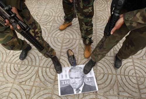 在巴勒斯坦的示威者也脚踩布什头像 中新网12月17日电 大公报消息:伊拉克记者扎伊迪凭借向布什掷鞋一夜成名,成了不少阿拉伯人心目中的英雄。他被捕后,巴格达数千民众十五、十