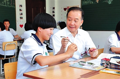 这次考察,温家宝在六道河中学停留了三个小时。和学生一起做完课外活动,听了一节王海燕老师的语文课。